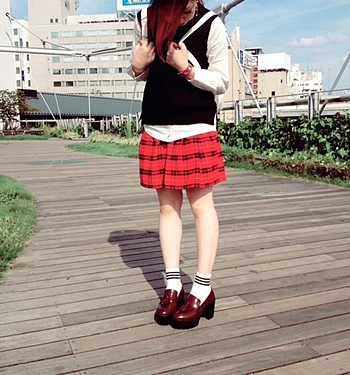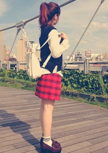 赤チェックスカートと合わせて秋らしいガーリーな装いに☆
