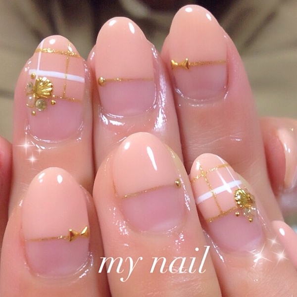 アクセサリーのようにぶら下がった夏のモチーフがかわいい丸フレンチ。やわらかな色合いがシェルやヒトデの雰囲気と良く合っています。