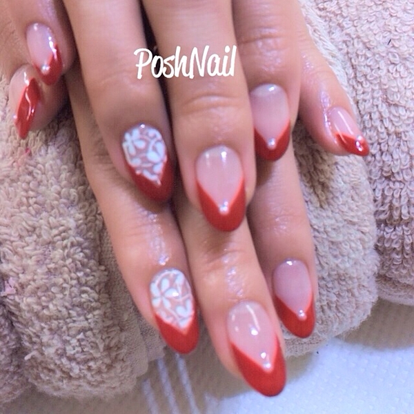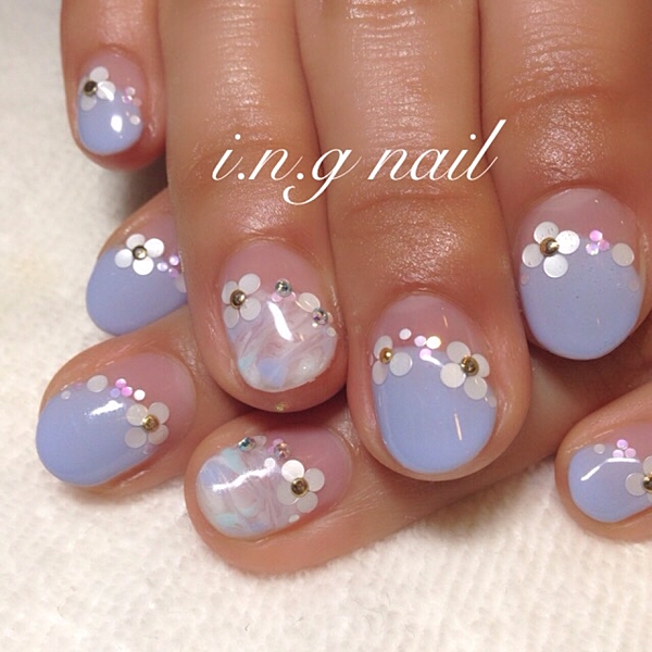 重なり合ったお花でフレンチ部分を作った変形フレンチ。全面にアートをいれるのではなく、ベースのクリア感を残してヌケ感をプラス。