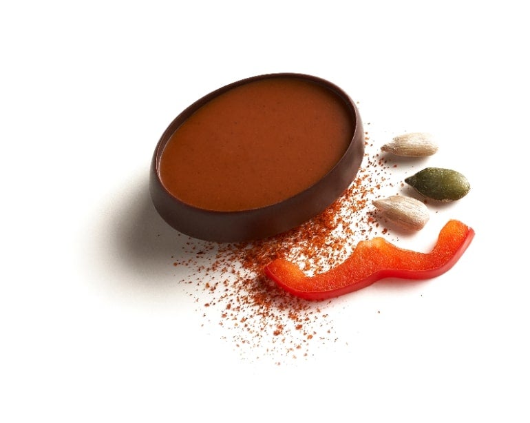 白ワインに合うように開発されたチョコレート「Graines-グレイン-」。カボチャとひまわりの種を加えた、甘いチョコレートと、パプリカパウダーがコーティングされているアーモンドプラリネだ。