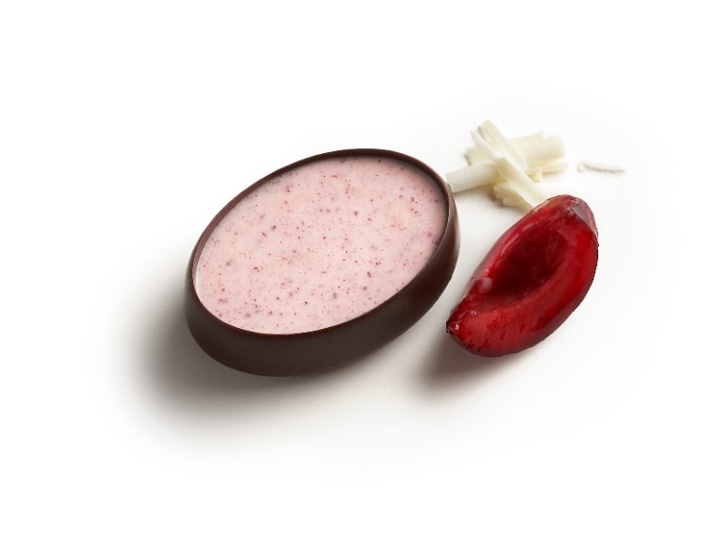 ホワイトチョコレートとカシスカカオバターで仕上げられた「Cerises -スリーズ-」。コスタリカ産チョコレート(65%カカオ)と、チェリーがフィリングされた独特なガナッシュで赤ワインにピッタリ。