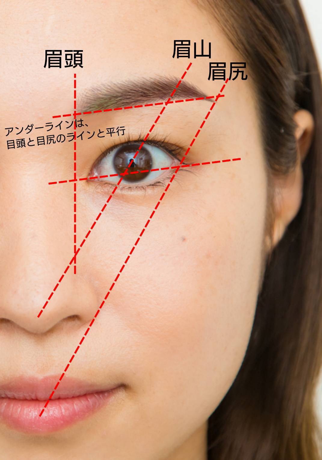 一般的に言われている眉の描き方と大きな違いは無いですが、ポイントは『アンダーライン(眉の下ライン)』の取り方です。