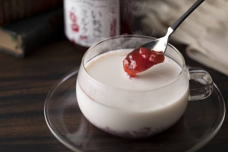 また、濃縮タイプのためさまざまなアレンジを楽しむこともできる。牛乳の代わりにヨーグルト、豆乳、アーモンドミルクなどを入れてヘルシーに。寒さが続くいまの時期には、温かいいちごミルクでほっと一息。