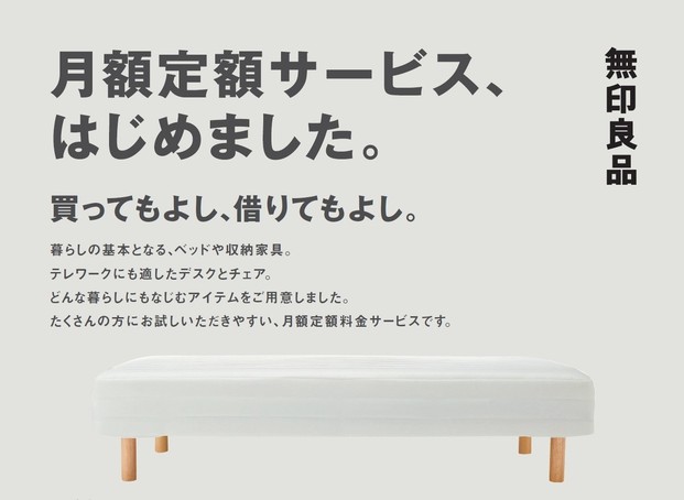 月額定額サービス開始のお知らせ!無印良品は、くらしの基本となるベッド、デスク、チェア、収納用品など、無印良品の家具の月額定額サービスの承りを、1月15日より、日本国内182舗にて開始しています。