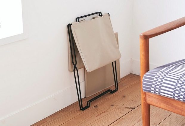 スタンドを広げた内側にもボックスのような収納部分があり、ティッシュボックスやスプレーボトルなど、面積のあるものを入れることも可能。スチール製で軽く、ものを入れたまま楽々持ち運べます。