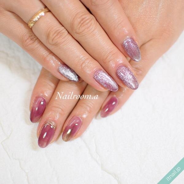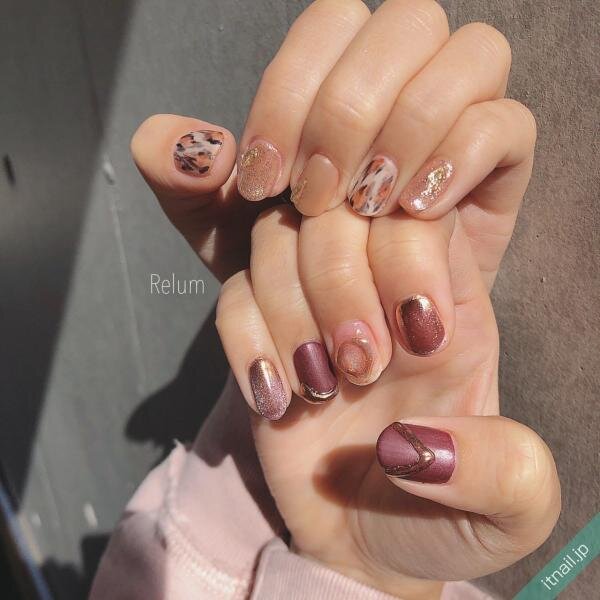 こちらは、ファッショナブルなプラムネイルです。右手と左手でカラーが違うのもオシャレですが、主張の強いプラムカラーに対して、控えめなピンクベージュでシンプルに抑えているのも素敵です。
