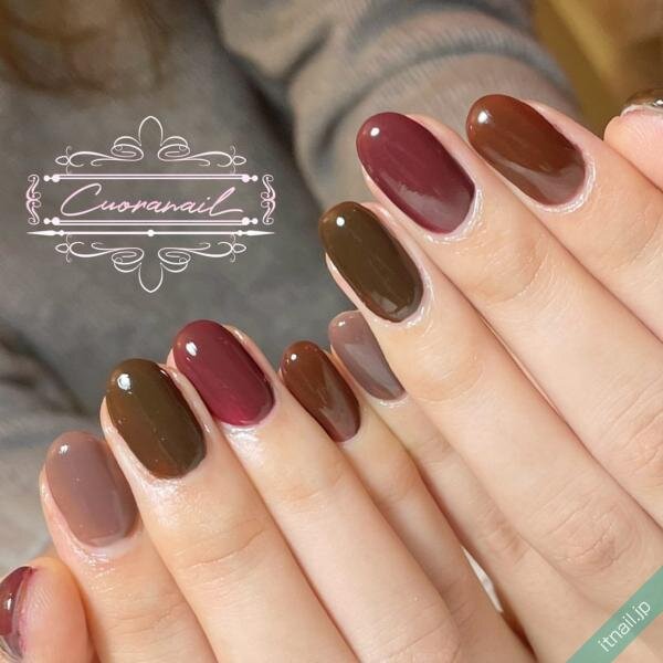 こちらは、シアー系の濃い目のカラーとプラムカラーを組み合わせたデザインです。全体のカラーの明度や彩度を揃えることで、全体的に落ち着いた雰囲気に仕上がっています。シンプルで上品なプラムカラーが好きな方には、おススメです。