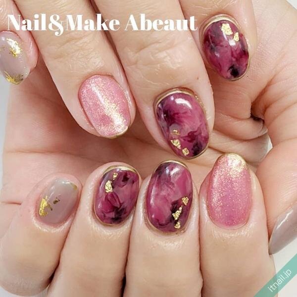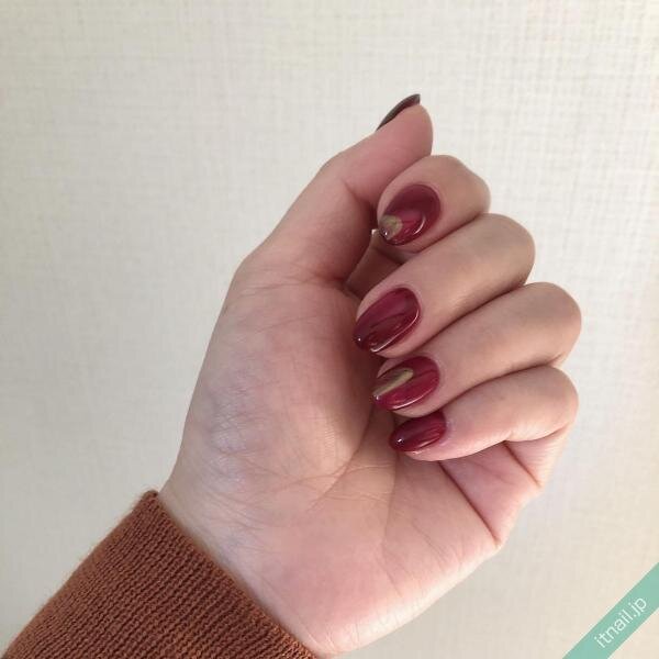 抽象的に置かれたゴールドのおかげで、ニュアンスネイルっぽく抜け感のある感じに仕上がっています。上品でシンプルだけど、少し華やかなプラムネイルを楽しみたい方にはおススメのデザインです。