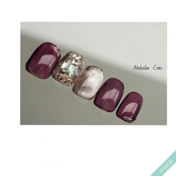 こちらは、囲みネイルがとてもオシャレなプラムカラーネイルです。ワンポイントで置かれたマグネットネイルやシェル風のデザインも素敵ですね。プラムカラーはグレージュと組み合わせることでだいぶ品格が増すので、どんなカラーを組み合わせれば良いか迷ったときには、ぜひおススメですよ。