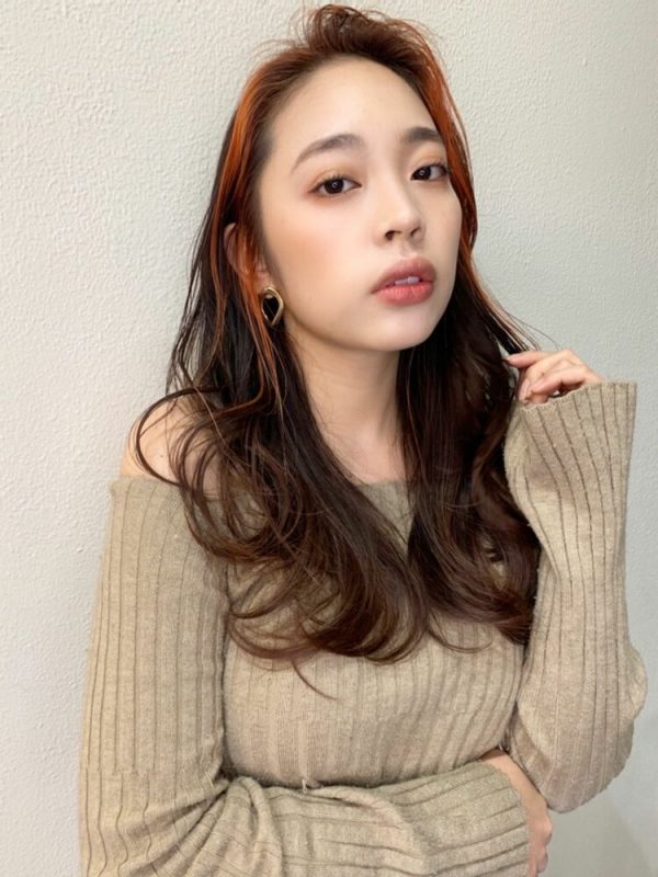 上段を内巻きに、下段を外ハネに仕上げたロングヘアは、ミディアムとは違った女性らしい魅力が溢れます。