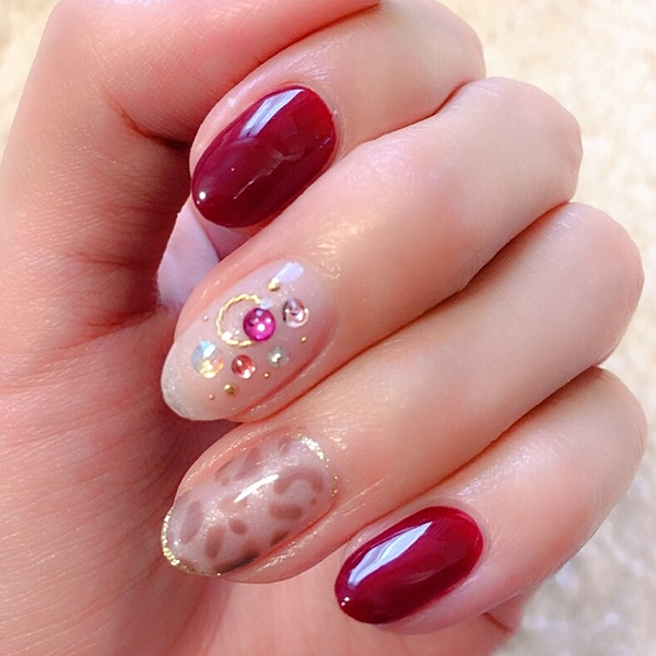 ブルーの大きなストーンがポイントの赤ネイル。