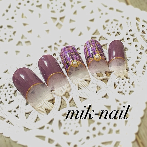 ボルドーやカーキを着るからこそ《くすみパープル》をネイルで差し色に。