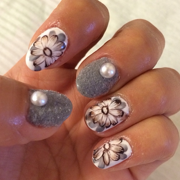 シルバーのラメが華やかなフラワーネイル。
