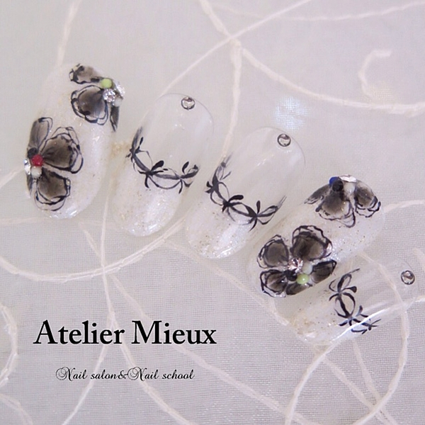 シルバーラメもモノクロのシンプルなフラワーネイルなら大人っぽい仕上がりに。