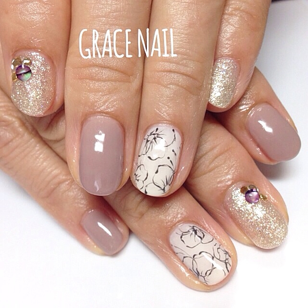 ベージュピンクとスモーキーなグリーンで秋冬にピッタリのフラワーネイルに!