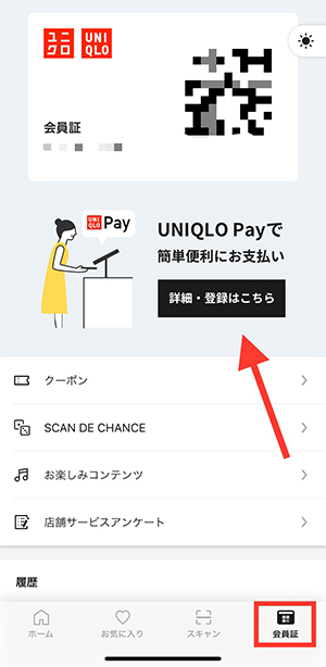 UNIQLO Payの登録は、「会員証」のタブで行います。