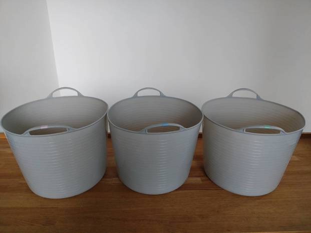 リビングに置いてある娘のオモチャはかごに放り込むだけ。細かく仕切ると戻すのが面倒なので、シンプルに放り込むだけが戻しやすい。