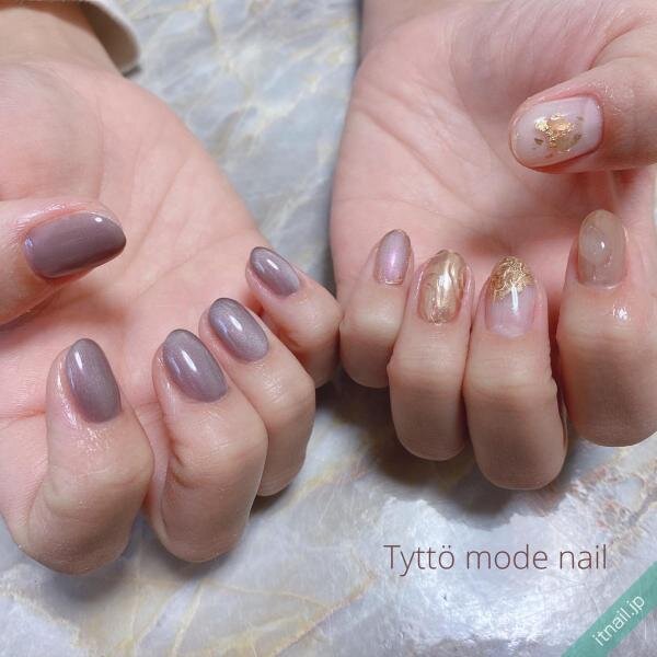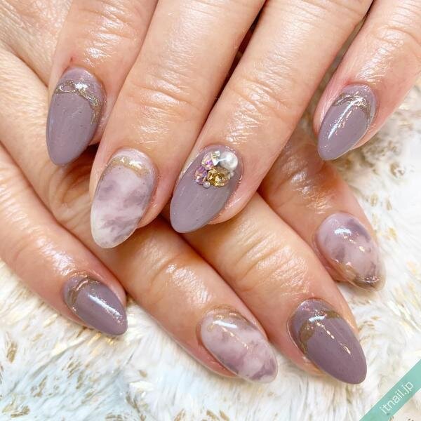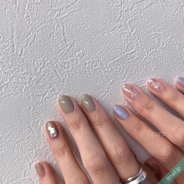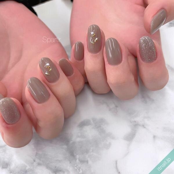 程よい存在感のある中間のグレーネイルなら、ワンカラーでシンプルに仕上げるのもおすすめです。左右でデザインを変えるアシンメトリーなネイルにすれば、大人な雰囲気を残したまま今っぽさ溢れる指先になりますよ。