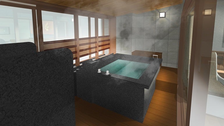 「半露天温泉付特別室」へリニューアルするのは、ワンランク上の滞在を楽しめる客室「オトナの休日」全6室のうち、3室。元々カウンターがあった場所に、ゆったりと手足を伸ばせる広さの贅沢な半露天温泉(準天然温泉)を設置する。湯船に浸かりながら瀬戸内海を眺めれば、疲れた体が芯からじんわりとほぐれていくだろう。