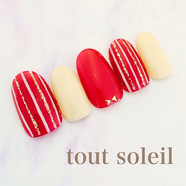 赤の1色塗りの中に、1本だけべっこうネイルを入れて・・♪
