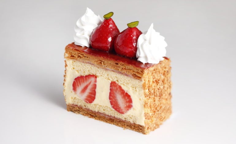 ホテル伝統のサクサクのパイ生地に、「博多あまおう(R)」と特製カスタードクリーム、長崎県産「太陽卵」を使用したふっくらとしたスポンジをサンド。食感も楽しい「あまおうナポレオンパイ」も見逃せない。