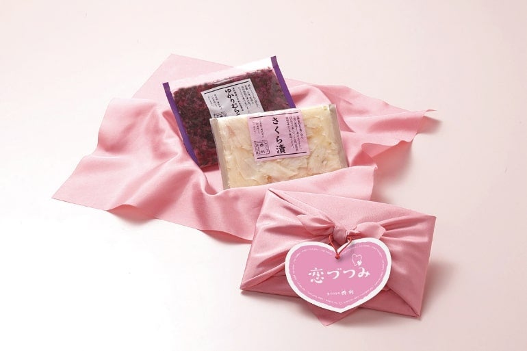 「さくら漬」「ゆかりむらさき」をピンクの風呂敷で包んだ「恋づつみ」は、「想いを包む」「ご縁を結ぶ」そんな気持ちを込めた手頃なギフト。