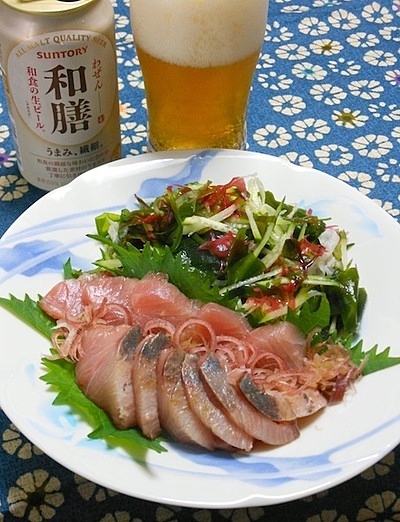 ■夏ぶりと海藻サラダのわさびポン酢添え。