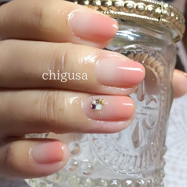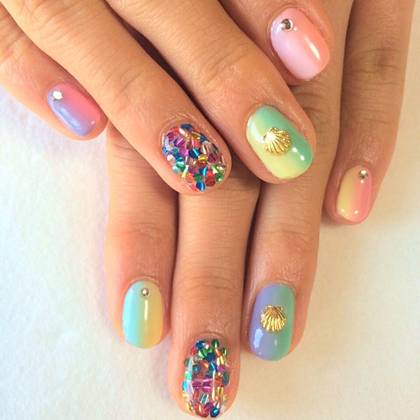 ゴールドシェルネイル コーラルピンクのグラデにゴールドシェル、オパール系ストーンをのせた大人可愛い夏ネイル http://t.co/yAq7yDga5M