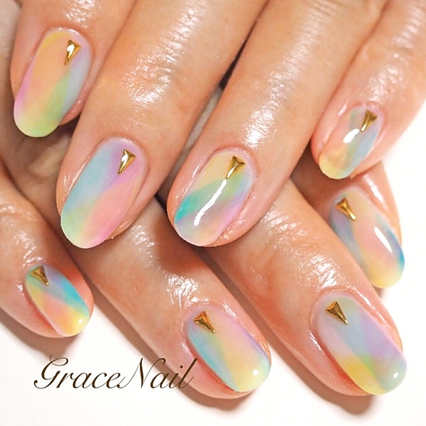 根元にゴールドシェルやスタッズを散りばめて、大人かわいい夏ネイル♪