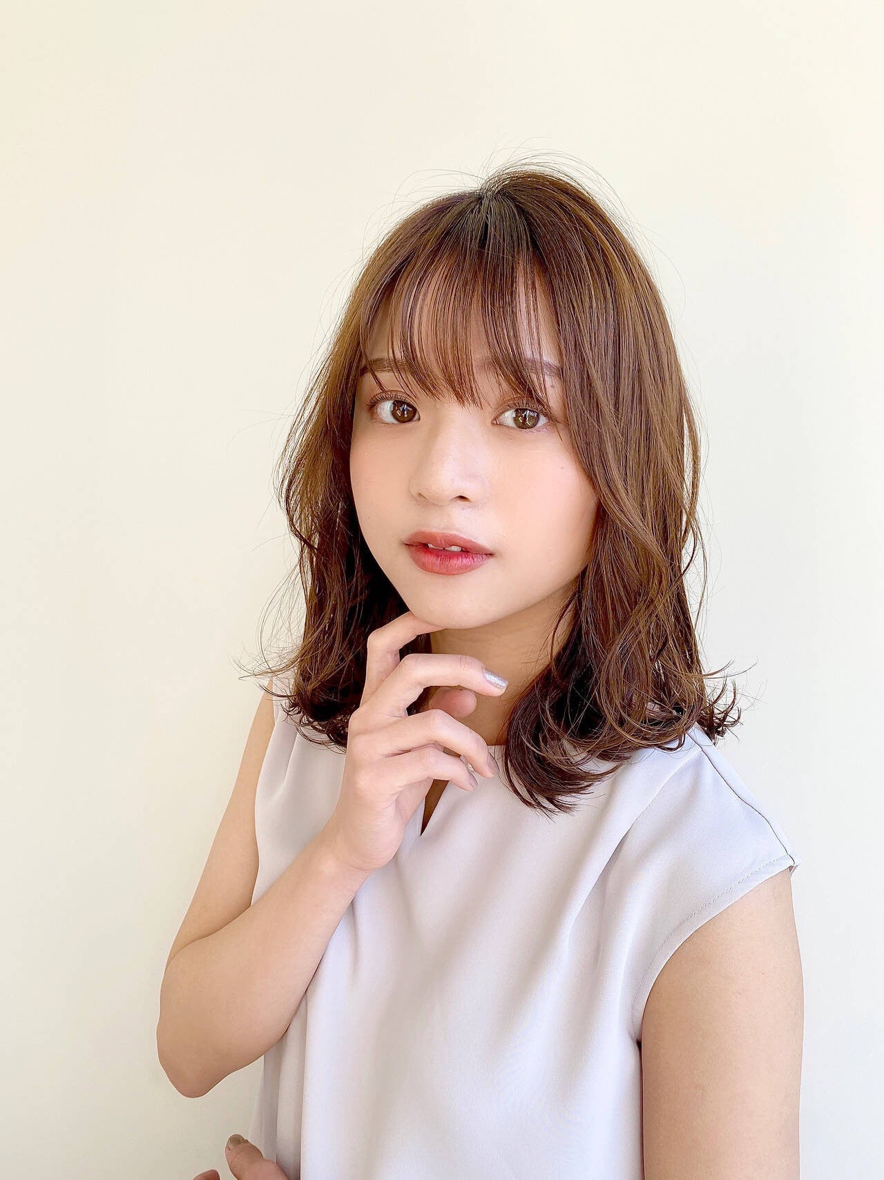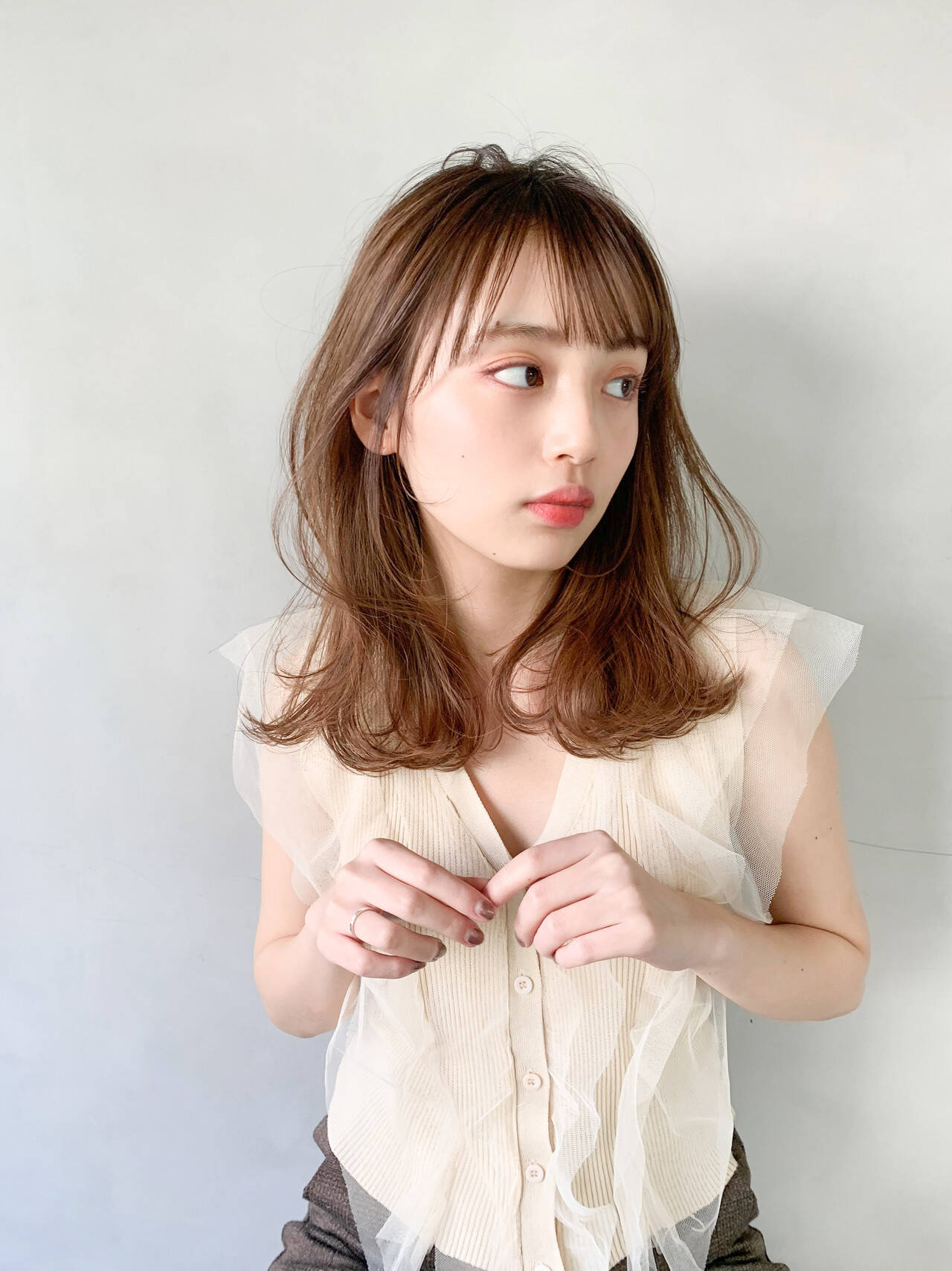 ふんわり柔らかな質感を生み出すゆる巻きミディアム。ゆるっと仕上がるクリープパーマや、コテでミックス巻きにして作ります。しっかり巻くのではなく、ゆるっとした動きで抜け感を出すのがポイント。前髪は毛束感を出しておでこをチラ見せすると、ピュアな雰囲気も。