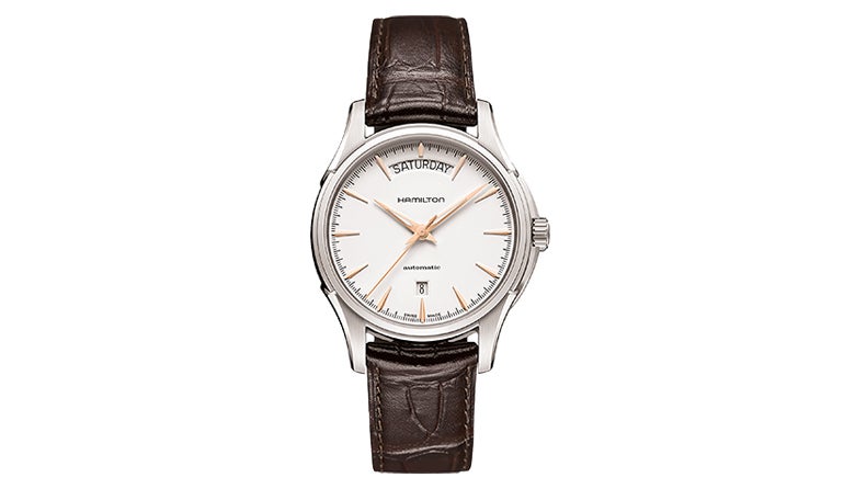 クラシカルなデザインと現代のクラフツマンシップが息づく、ハミルトンの「ジャズマスター Day Date Auto」。標準持続時間が同社従来品の2倍となる80時間を誇るムーブメントを搭載した自動巻き。ブラウンのカーフレザーとゴールドの色合いがシックで、フォーマルはもちろん、スーツスタイルにもコーディネートしやすい。モダンなドレスウォッチとしておすすめだ。