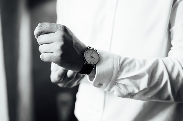 フォーマルなシーンで身につける「ドレスウォッチ」。基本的には、アナログ式の2針、ラウンドタイプ、ブラックレザーベルト、袖口に収まるサイズ感、白の文字盤、無駄な機能や装飾のないシンプルなデザインが求められる。