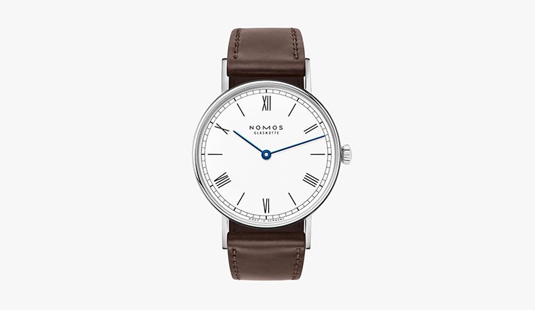 ドイツのグラスヒュッテで全ての時計を生産し、ムーブメントも設計から製造までを自社で行なうというマニュファクチュール「ノモス グラスヒュッテ」。2針の手巻きウォッチ「ラドウィッグ 33 デュオ ホワイトエナメル」は、一度巻き上げると最長で43時間動き続け、3気圧の日常生活防水性を備える。ホワイトエナメルの文字盤に青焼きの針、艶やかなコードバンのベルトが美しい。ドイツらしさを感じるすっきりとしたデザインのドレスウォッチだ。