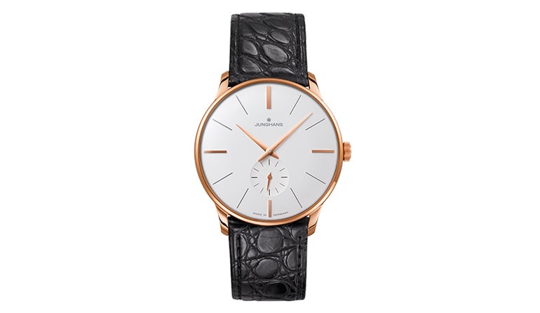 「ユンハンス」は、1861年にドイツ・シュランベルクで創業した時計ブランド。手巻きムーブメントのドレスウォッチ「マイスター ハンドワインド」は、ミニマルな盤面デザインに、黒のアリゲータストラップがモダンな印象。30m防水で、ドーム型のプレキシガラスの風防を持つ。6時の位置にスモールセコンドが付いており、さらにシースルーバック仕様と、時計好きにはたまらないドレスウォッチだ。