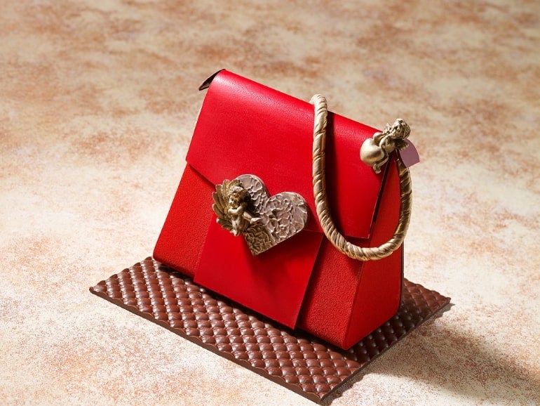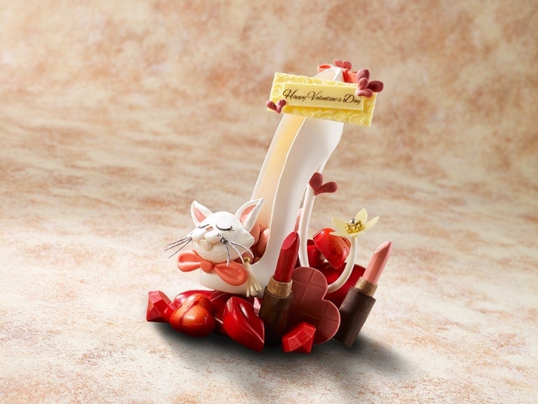 しなやかな猫の体部分はスイス産ミルクを使ったホワイトチョコレートを使用。また猫を囲むハートのチョコレートにはシャンパンロゼ、魅惑的な唇は日本酒を含んだボンボンショコラでデザインされており、見た目はもちろん、味わっても楽しさ広がる一品だ。