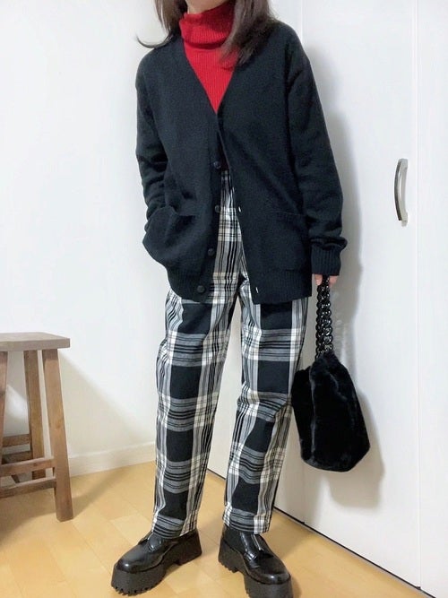 インナーにしまむらの赤ニットを使ったコーディネートは、ほかのアイテムをモノトーンカラーにしていても着映え効果があります。