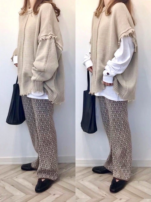 着心地がラクチンなリラックスコーデですが、しまむらのジャガードニットパンツのおかげで上品さが出ているので野暮ったく見えませんね。