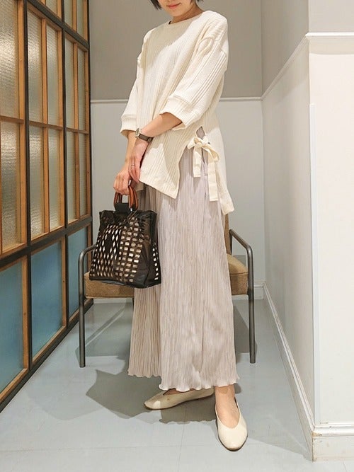 白リボン付きトップス×スカートの春コーデ