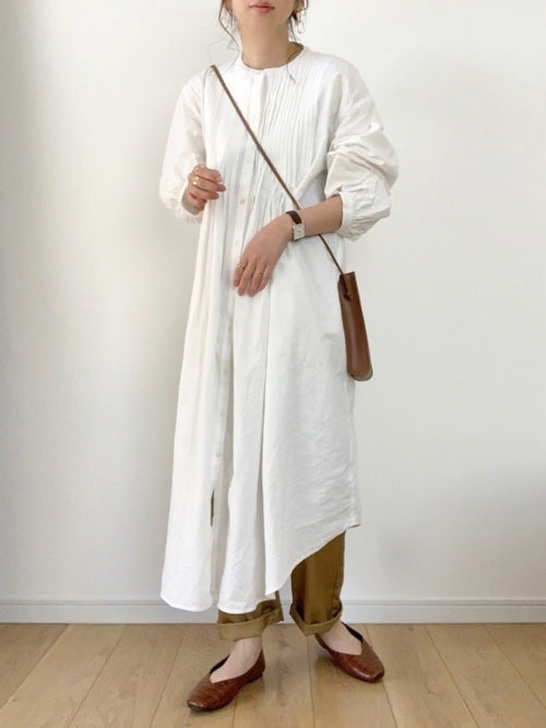白シャツワンピース×ベージュパンツの春コーデ