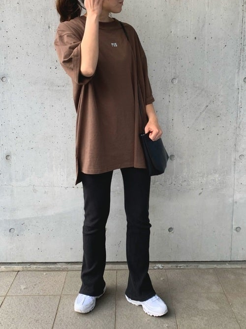 茶色ロゴ入りトップス×黒リブパンツの春コーデ