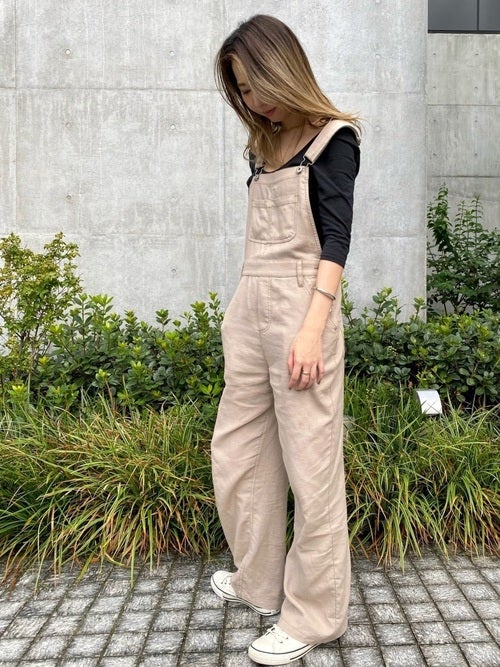 黒トップス×ベージュサロペットの春コーデ
