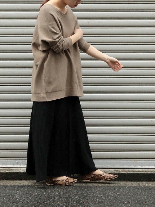 トップスはブラウンのオーバーサイズスウェットでリラクシーにまとめたら、辛口なパイソン柄のフラットパンプスでマタニティ向けコーデにスタイリッシュな要素をプラスするのもお忘れなく。