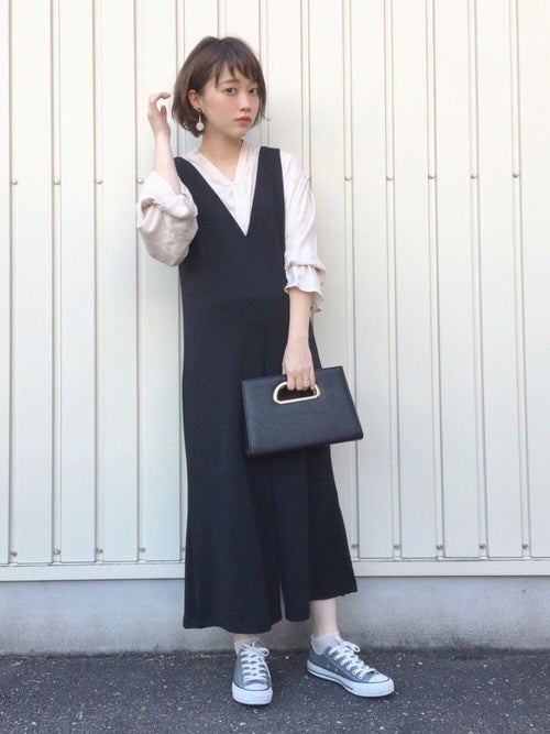 ブラウス×黒Vネックサロペットの春コーデ
