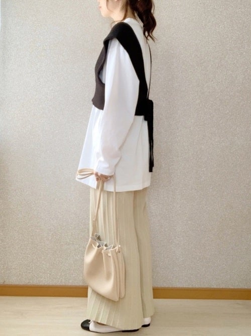 黒ニットベスト×ベージュパンツの春コーデ