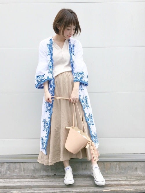 刺繍入りガウン×ベージュスカートの春コーデ