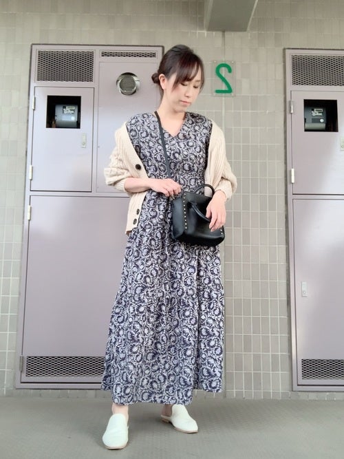 マタニティ期間でも着痩せを意識した着こなしをしたいぽっちゃり体型さんには、ダークネイビー&ウエストギャザーで細見えするペイズリー柄のプチプラロングワンピースをチョイスするのがおすすめ。