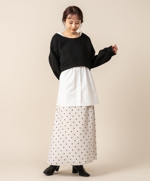 ドットスカートを今年らしく着こなすには、シャツレイヤードがおすすめです。