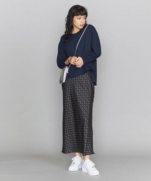 光沢感のある生地が、リッチ見えする柄スカートはあえてスニーカー合わせがおしゃれ!
