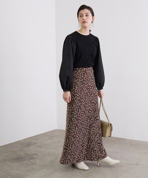 小花柄のスカートは、ブラウンで品よくまとめると大人っぽく仕上がります。