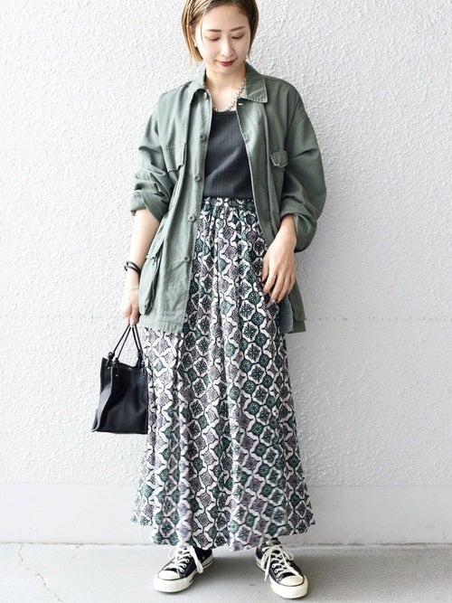 ミリタリージャケットと柄スカートがマッチした、メリハリスタイルです。